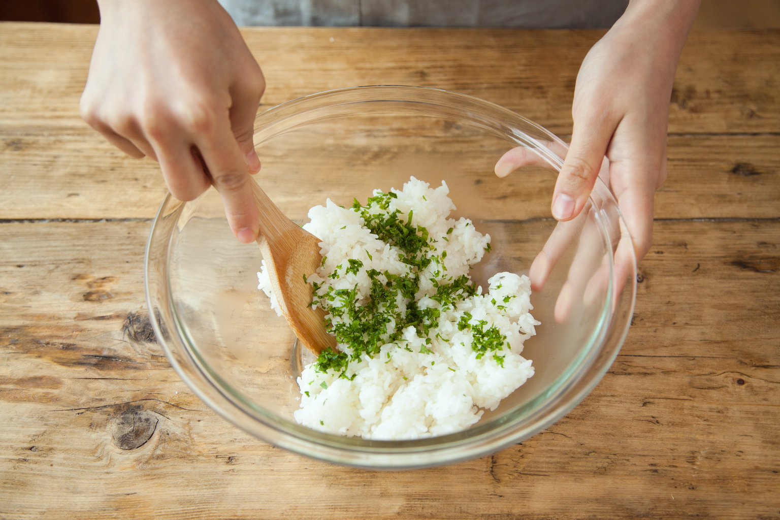 海苔の奥側2cm を残し、手を水で濡らしながら2のごはんを薄く広げる。