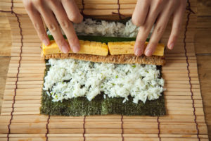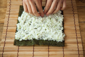 (※巻くとすし飯がぎゅっと詰まるため、海苔がすける程度に薄めに敷きます。)