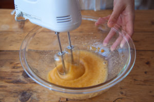 ボウルに卵、きび砂糖を入れ、ハンドミキサーで2分ほど混ぜる。