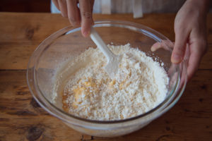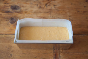 粉っぽさがなくなったら型に流し入れ、表面をととのえて数回軽く落として空気を抜く。