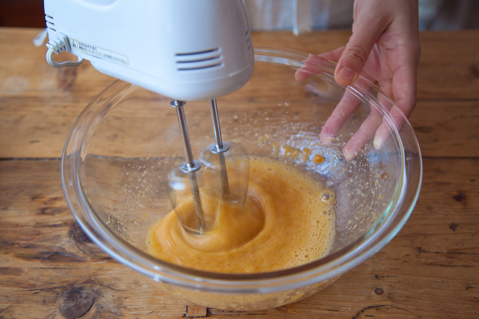 ボウルに卵、きび砂糖を入れ、ハンドミキサーで2分ほど混ぜる。