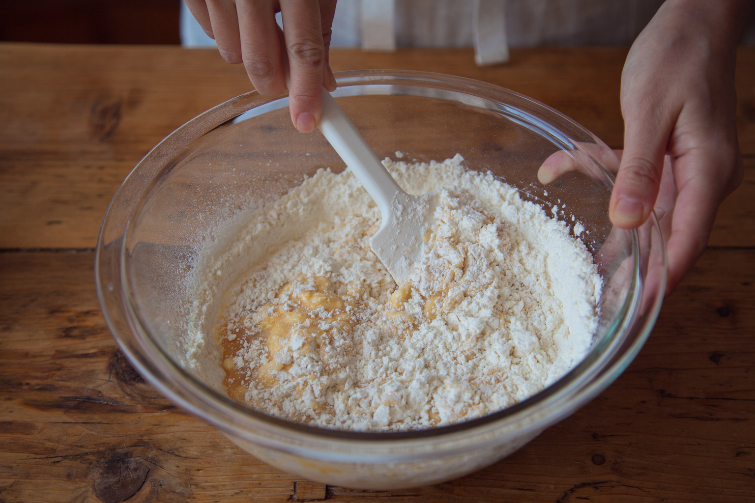粉っぽさがなくなったら型に流し入れ、表面をととのえて数回軽く落として空気を抜く。