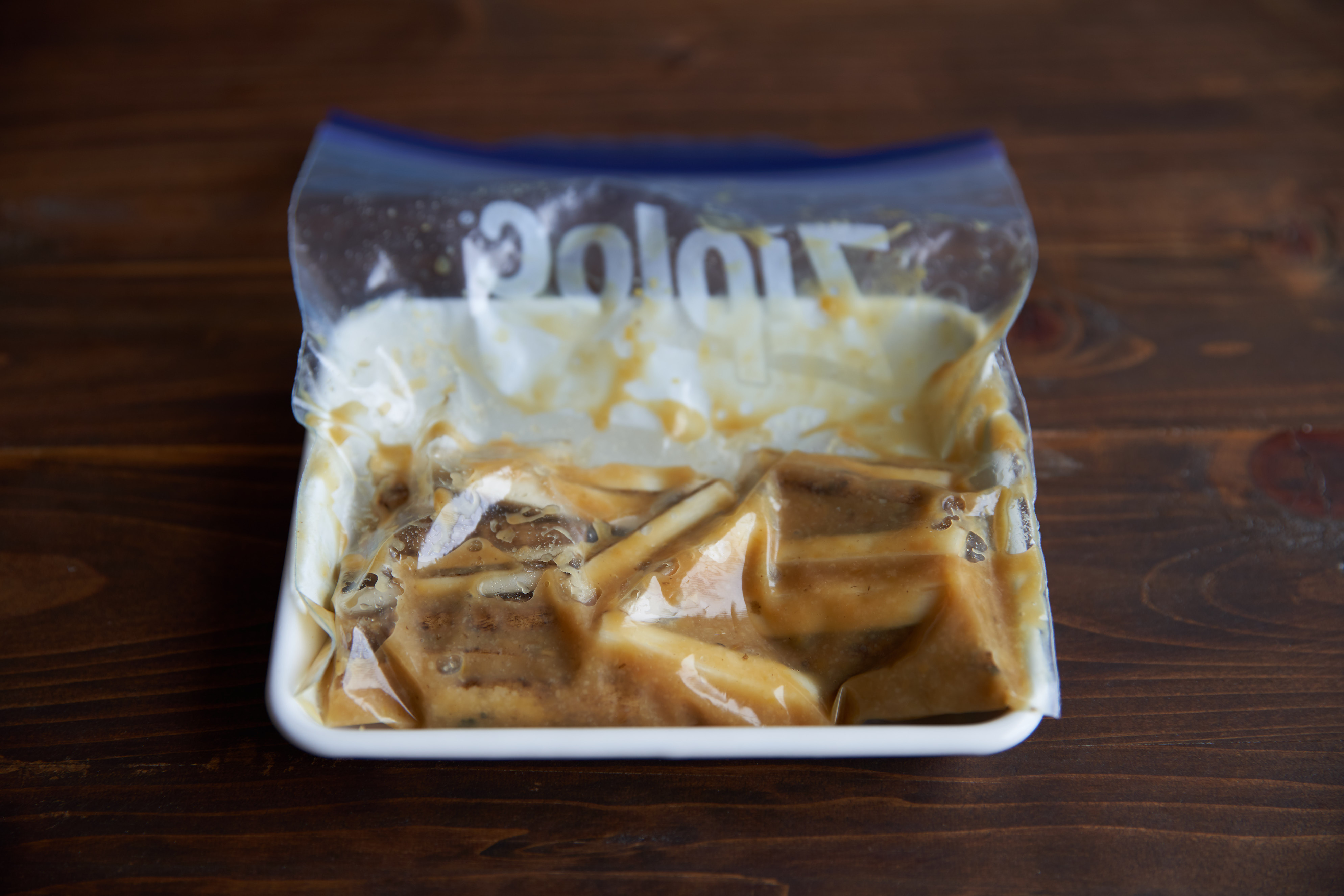 ジッパー付き保存袋に、水気を切ったごぼう、漬けだれを入れて混ぜ、空気を抜いて一晩漬け込む。