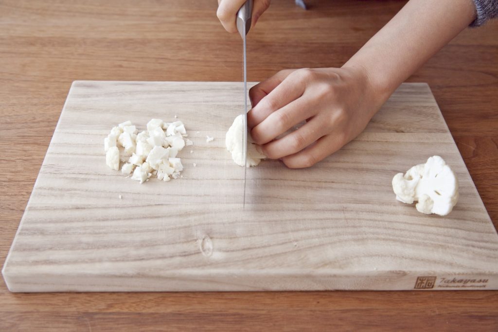 ②玉ねぎをみじん切り、カリフラワーを1cm角程度に切る。