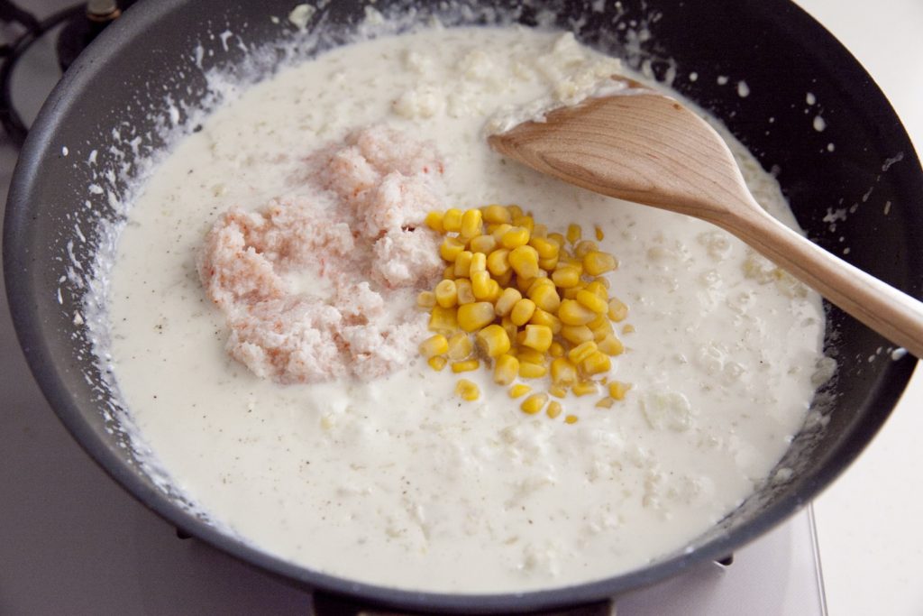 ⑤とろみが出たら生クリーム、塩こしょう、カニ缶、コーン缶を汁ごと加えてソースにする。