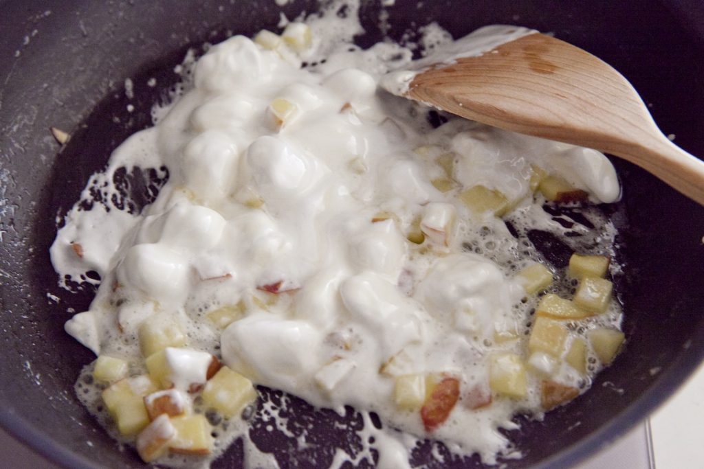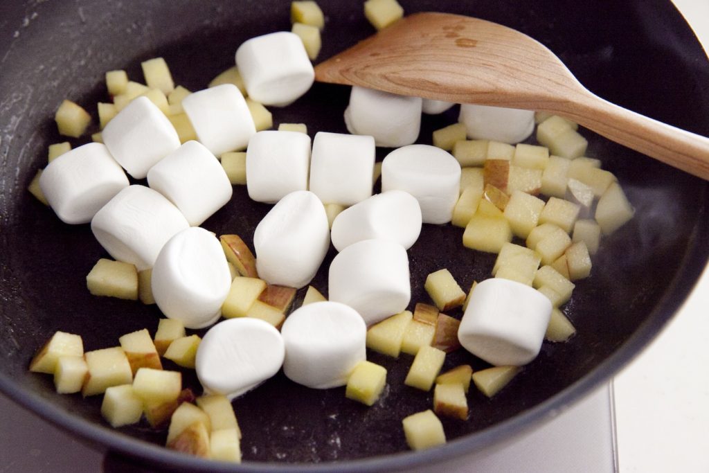 しんなりしたら、火を弱めてマシュマロを加え、焦げないように常に混ぜながら熱する。