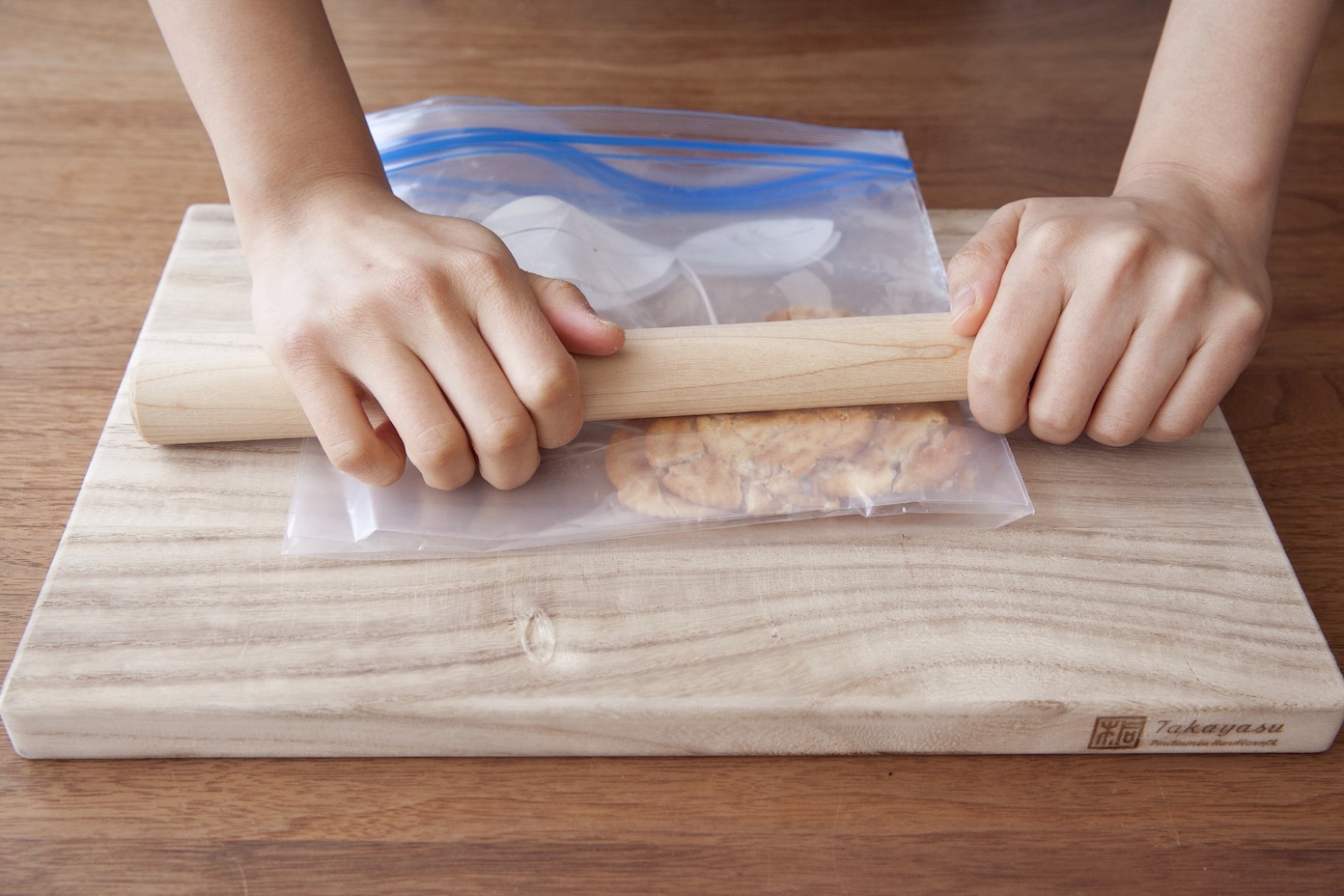 クラッカーを麺棒をころがすようにして細かく砕く。