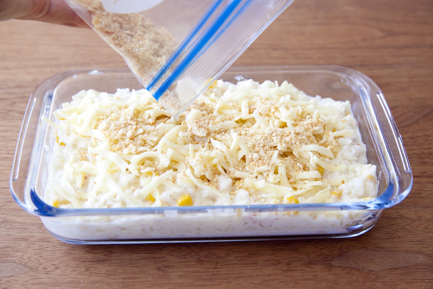 ミックスチーズ、クラッカーをのせてオーブンで焼き色がつくまで10分ほど焼く。