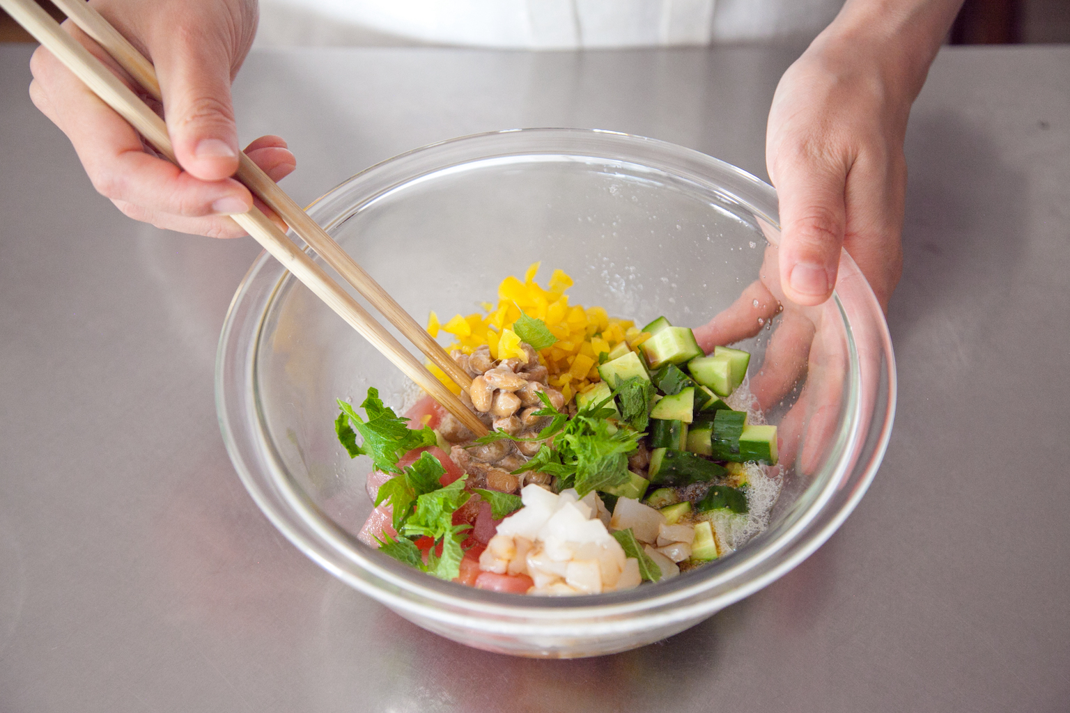 納豆にお刺身や野菜、漬物などを加えてよく混ぜた、