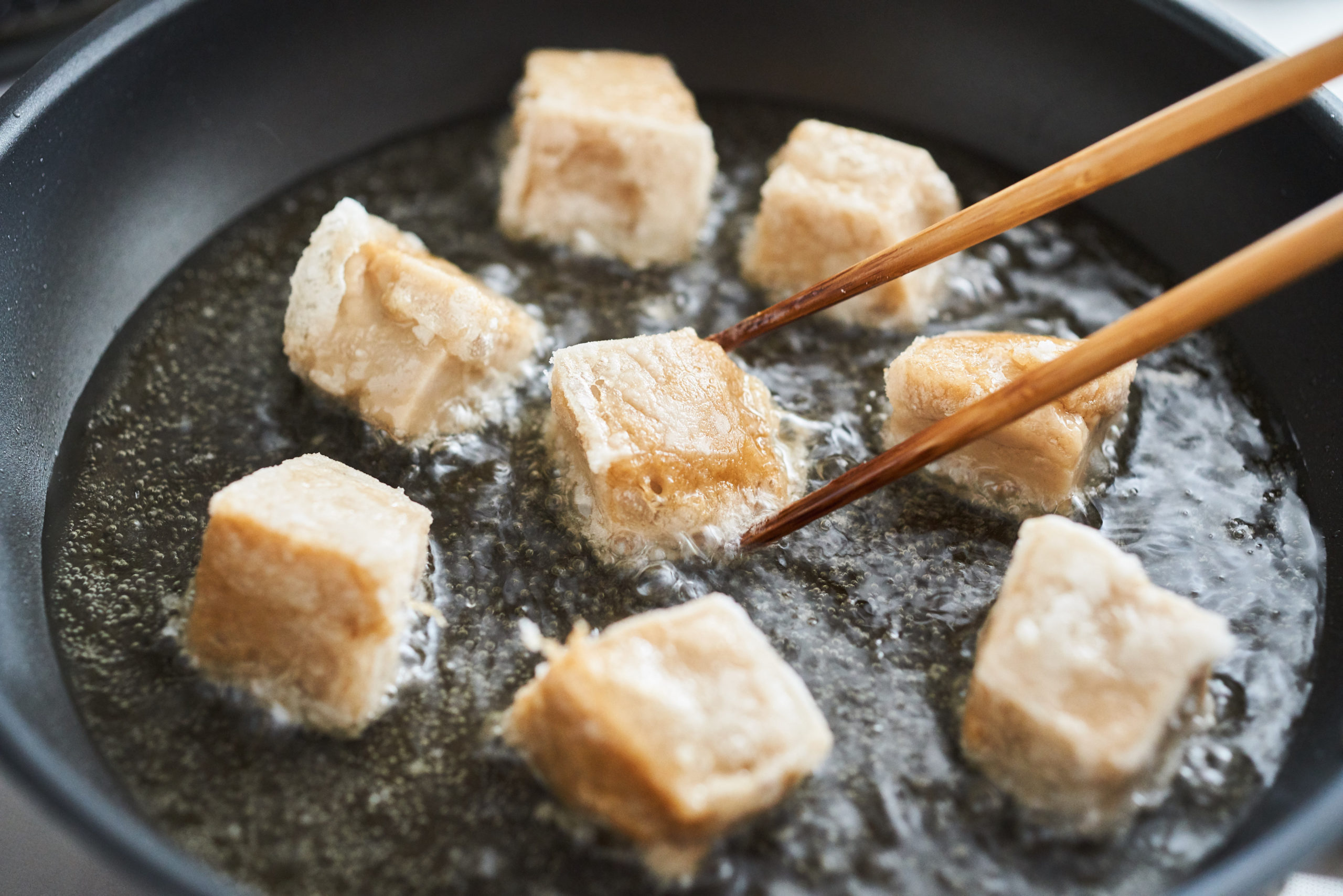 フライパンで簡単に、ごま豆腐で作る、揚げ出し豆腐の作り方です。