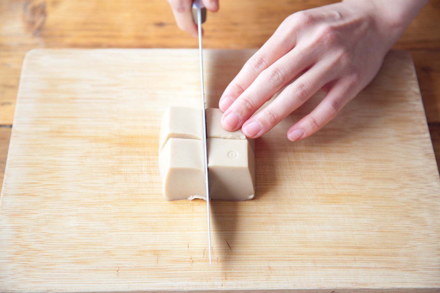 菜の花はしっかり水気を拭き取り、半分の長さに切る。ごま豆腐は4等分に切る。