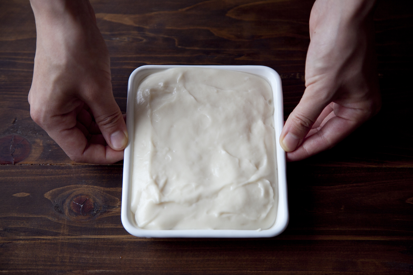 今回冷やし固めたバットは小さめ(15cm×12cm×高さ3cm程度)のものですが、お手持ちのものでOKです。