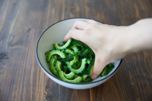 ゴーヤは縦半分に切ってスプーンなどで種とワタを取り除き、