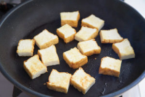 フライパンにごま油1/3量を強火で熱し、厚揚げを入れ、焼き色をつけ、一度取り出しておく。