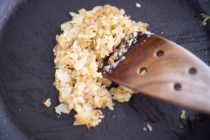 2と同じフライパンに、サラダ油大さじ1を弱めの中火で熱し、玉ねぎを炒める。