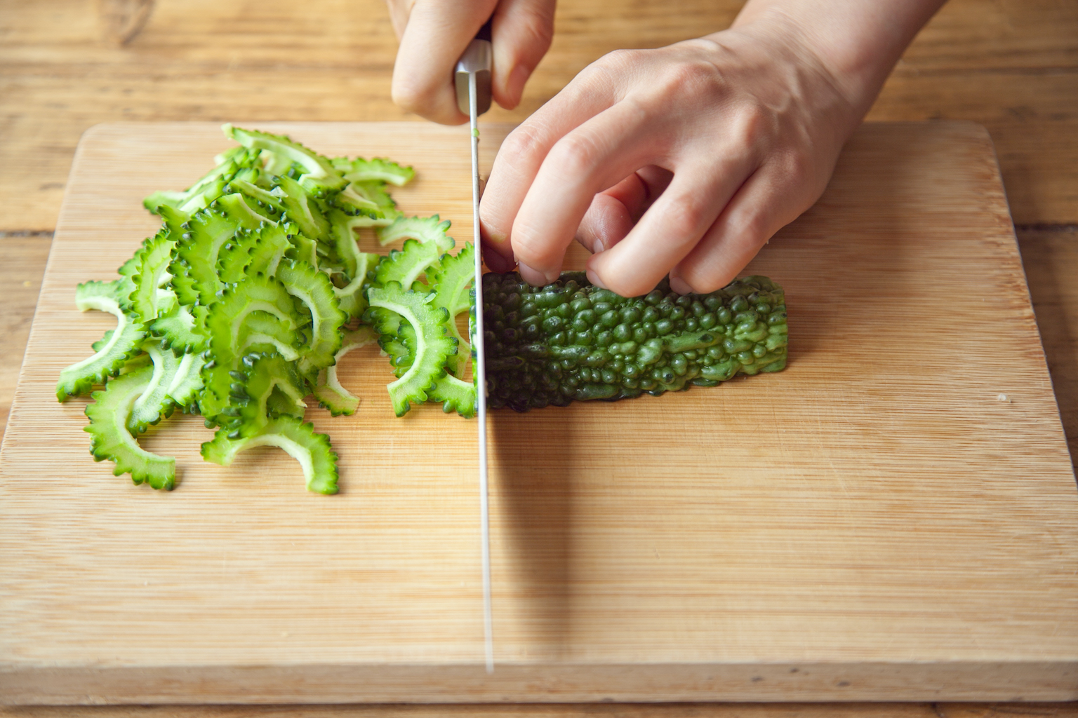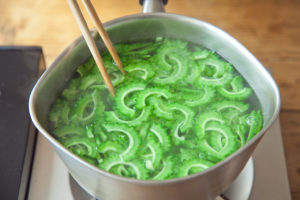 ゴーヤを1分ほど茹でてざるにあげ、流水で冷ましてから水気をしっかり絞る。