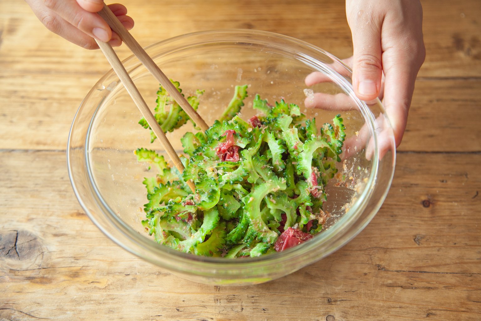 2のボウルに、ゴーヤ、かつお節を入れ、梅干しをちぎり入れて