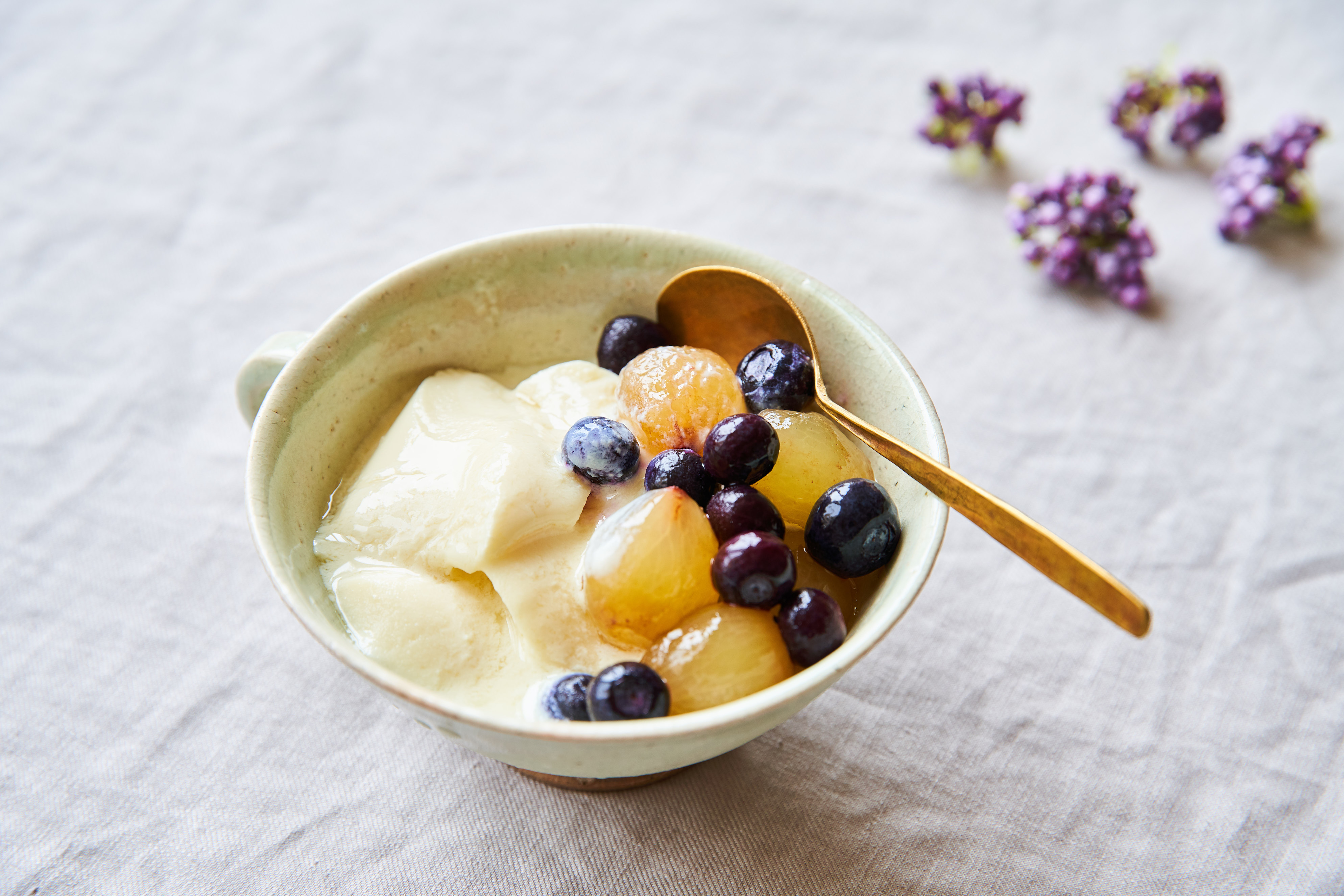 器に2をスプーンですくって盛り付け、皮をむいたぶどう、冷凍ブルーベリーを飾り、豆乳、「カルピス」(ソース用)を混ぜ合わせたソースをかける。