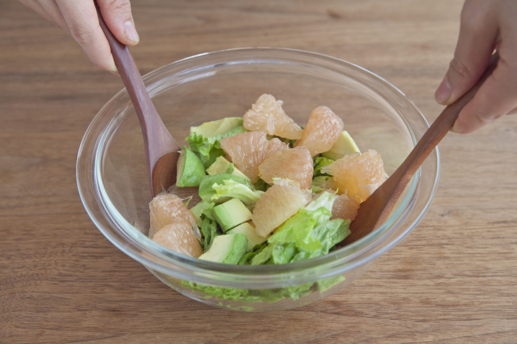 グレープフルーツは皮をむいて薄皮から実をはずす。アボカドは一口大に切る。くるみは粗く刻む。