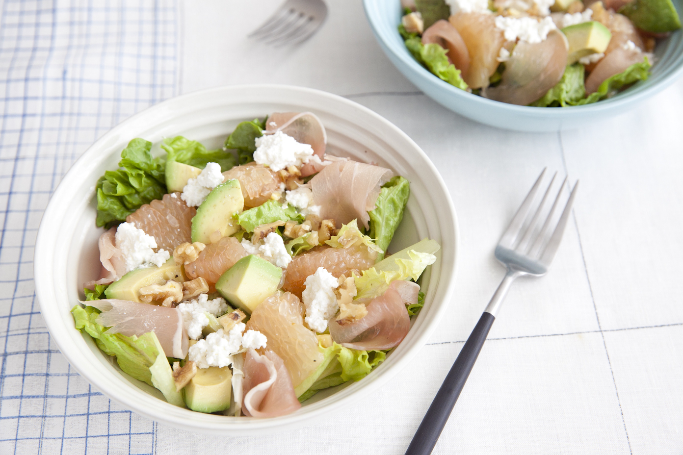 ボウルにグリーンリーフ、グレープフルーツ、アボカドを入れてドレッシングと和えて皿に盛り、生ハム、カッテージチーズ、くるみを散らす。