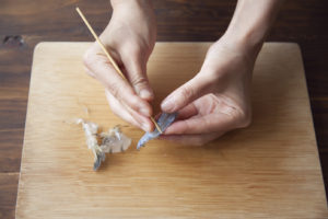 エビは殻と尾を取り除き、背に浅く包丁を入れて背わたをとる。