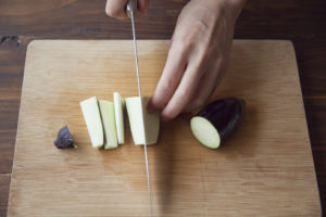 キャベツは3〜4cm四方、なすは長さに切ってから縦に6等分に切る。
