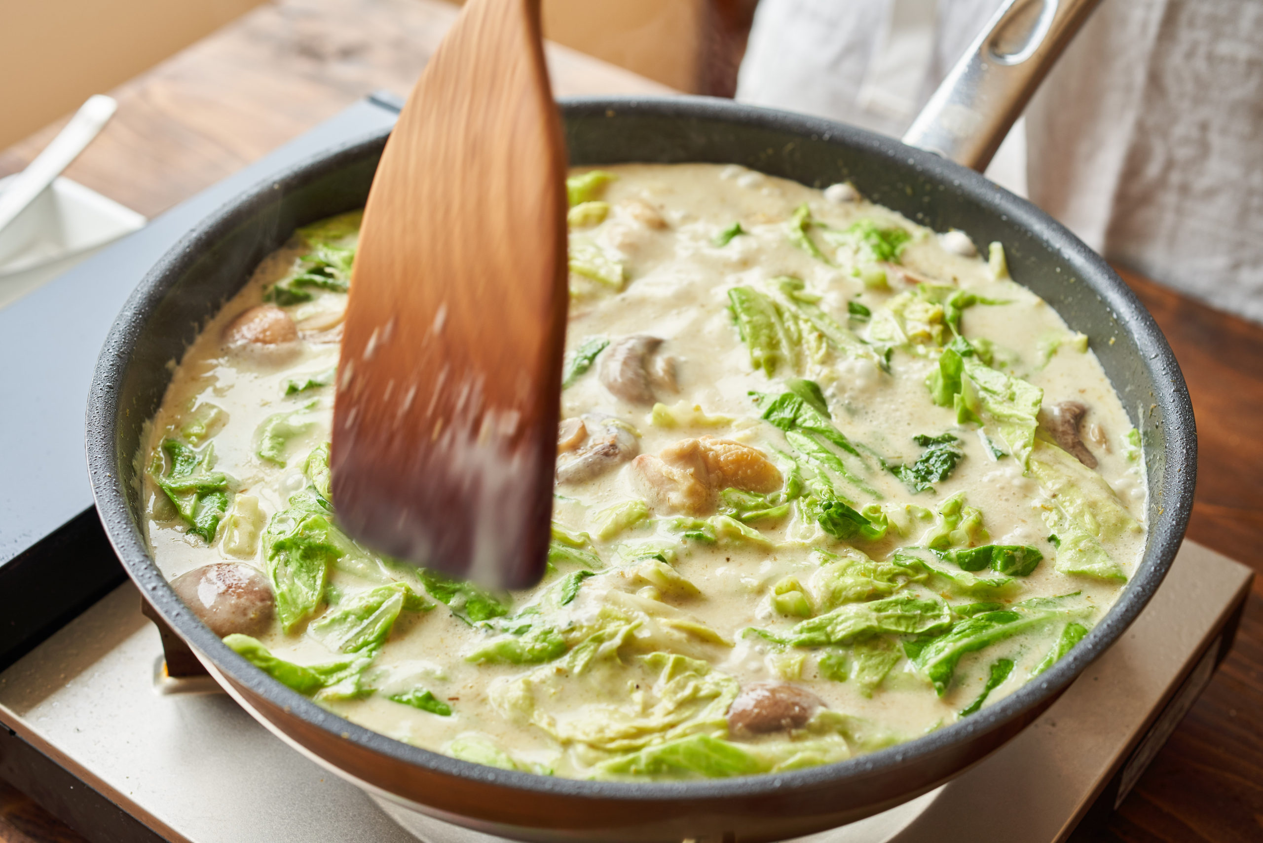 スパイスの香りが立ってきたら、ココナッツミルク、鶏ガラスープを加える。