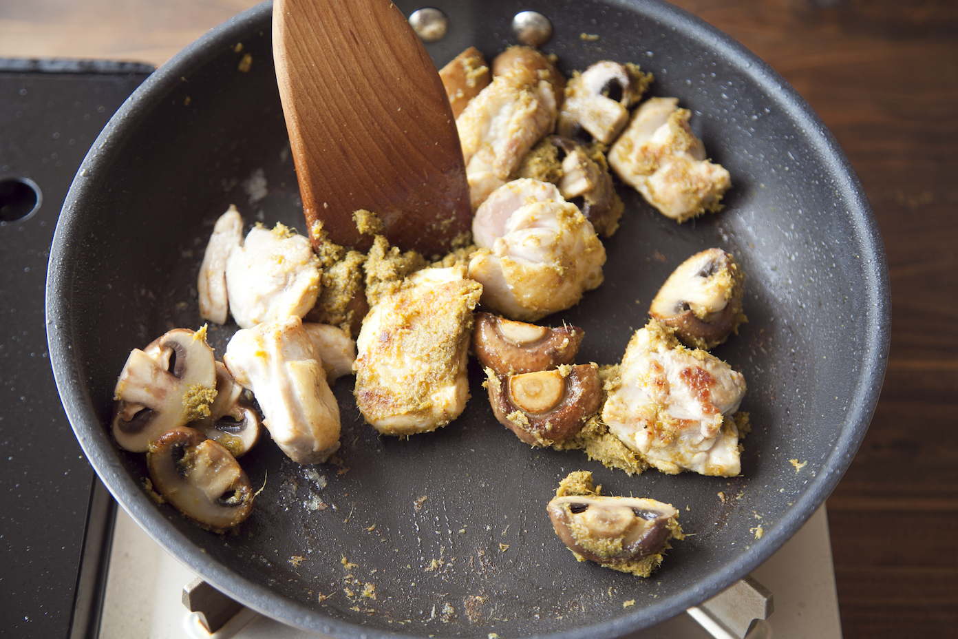 鶏肉、マッシュルームを炒める。