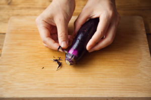 なすはヘタの周りに包丁でぐるりと切り込みを入れる。