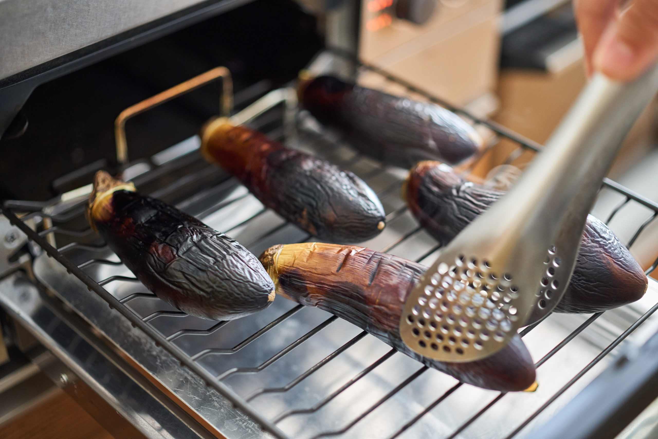 なすはグリルに入れて加熱し、8〜10分ほどしっかり全体が焦げて、