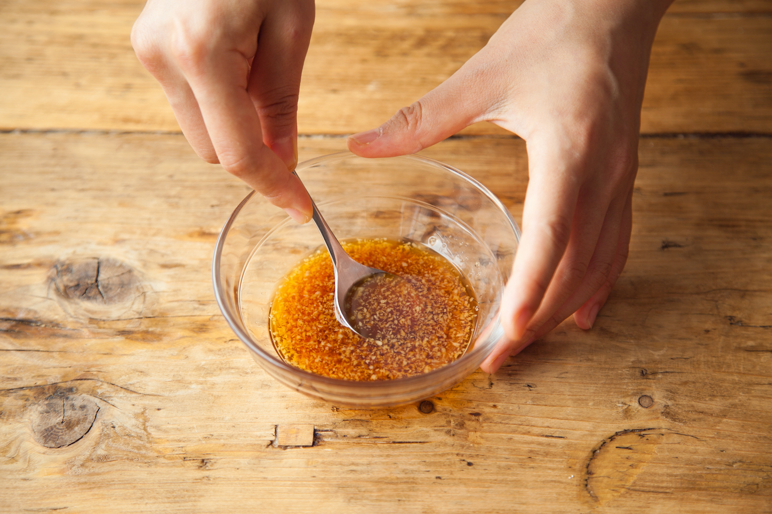(A)しょうゆ、みりん(煮切ったもの)、水 各大さじ1