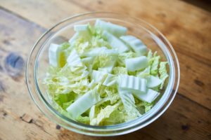 白菜を耐熱ボウルに入れ、ふんわりラップをかけて電子レンジ600Wで3分半加熱する。