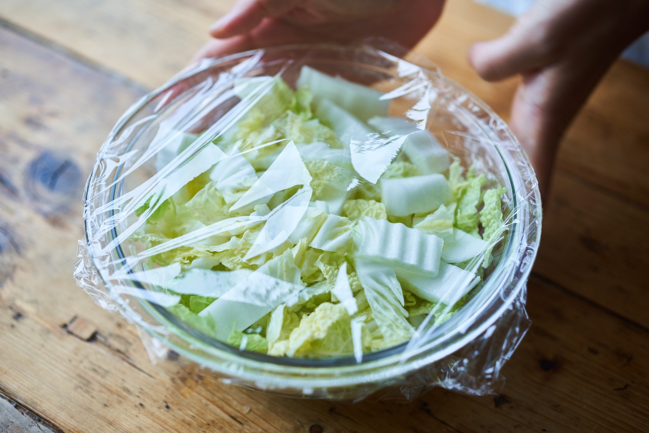 白菜を耐熱ボウルに入れ、ふんわりラップをかけて電子レンジ600Wで3分半加熱する。