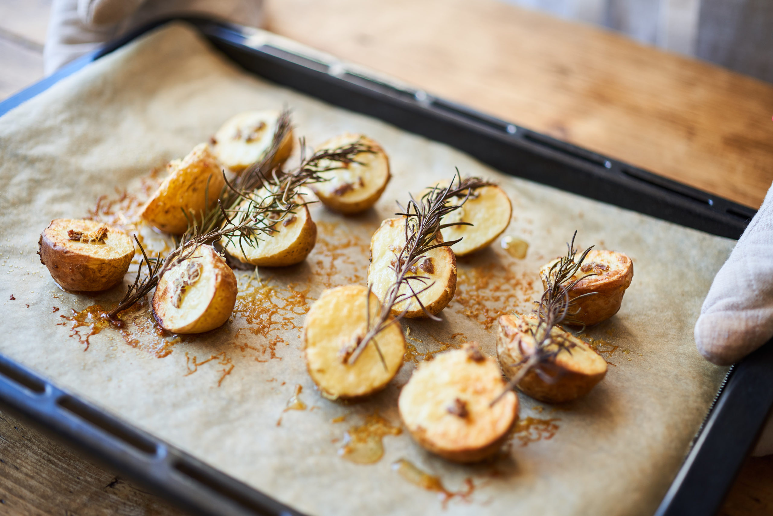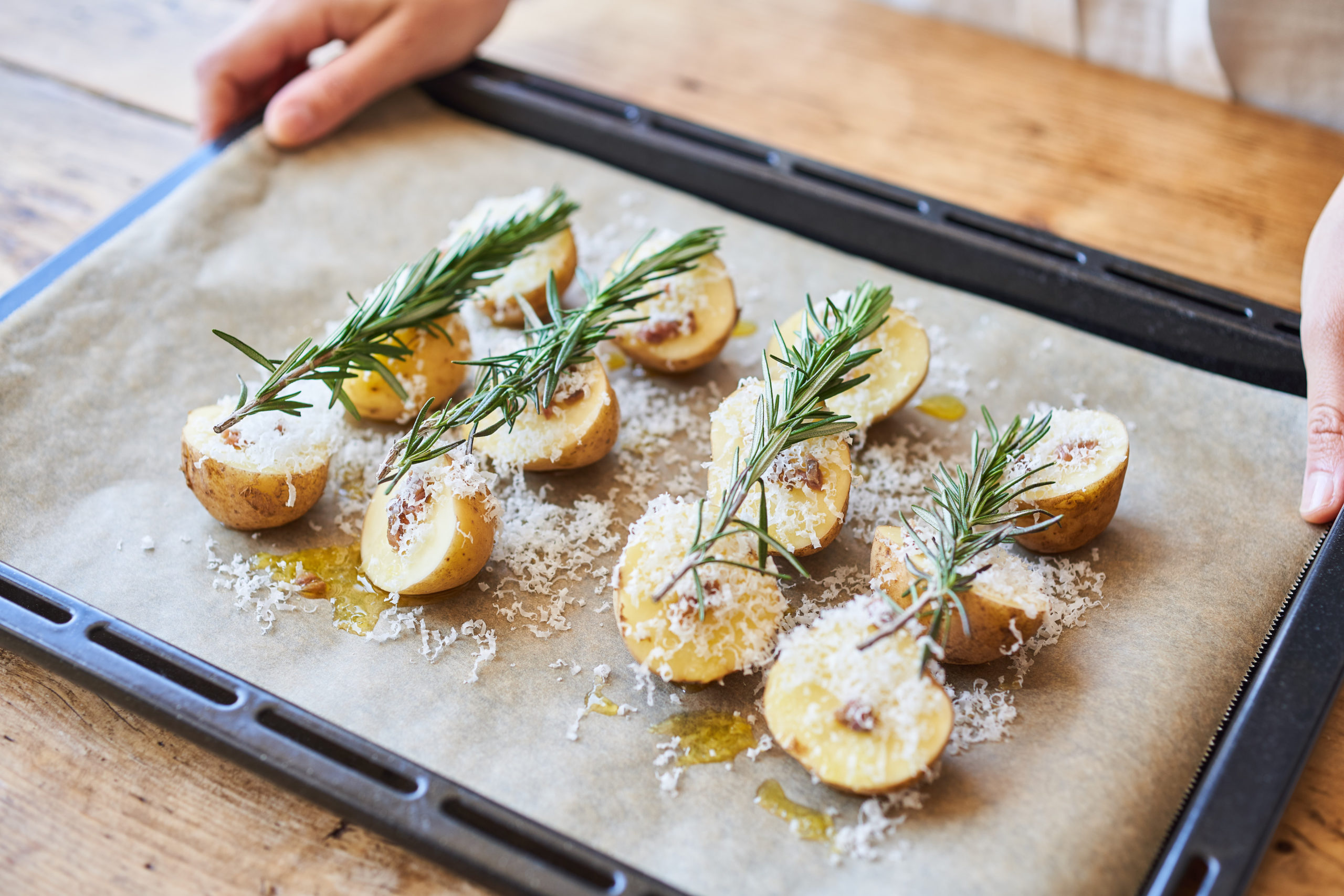 オーブンの天板にオーブンシートを敷き、じゃがいもをのせる。