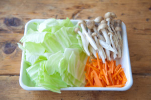 キャベツはざく切り、にんじんは細切り、しめじは石突きをとって手でほぐす。