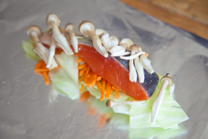 鮭、しめじをのせる。漬けだれを回しかけて包む。