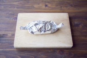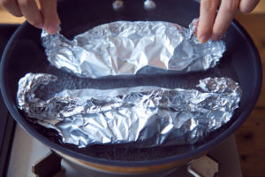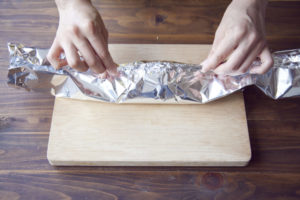 香りを楽しめるホイル焼きなので、蒸気がもれないようにしっかりと折り曲げます。