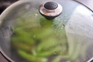 スナップエンドウの上下を返して弱火にし、水大さじ1を加えて蓋をする。