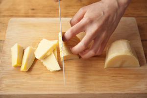 たけのこは穂先は食べやすい大きさに、他は5mm程度の薄切りにする。