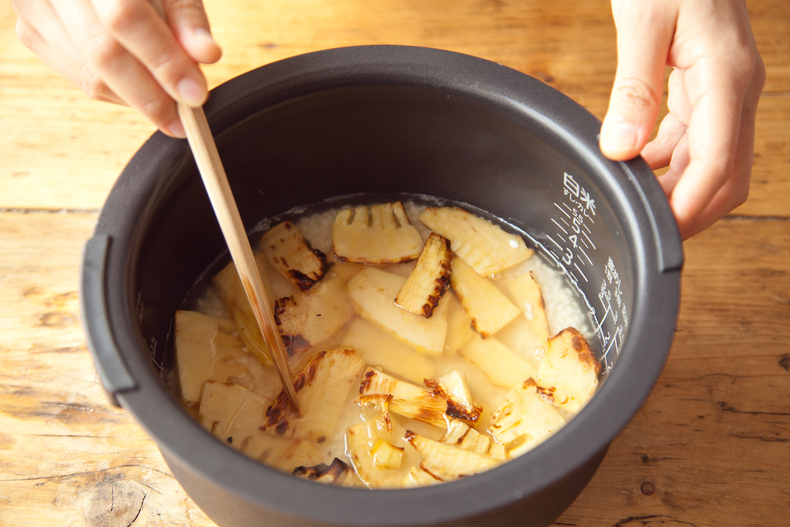 炊飯器の2合の目盛りまでだし汁を入れ、軽く混ぜる。