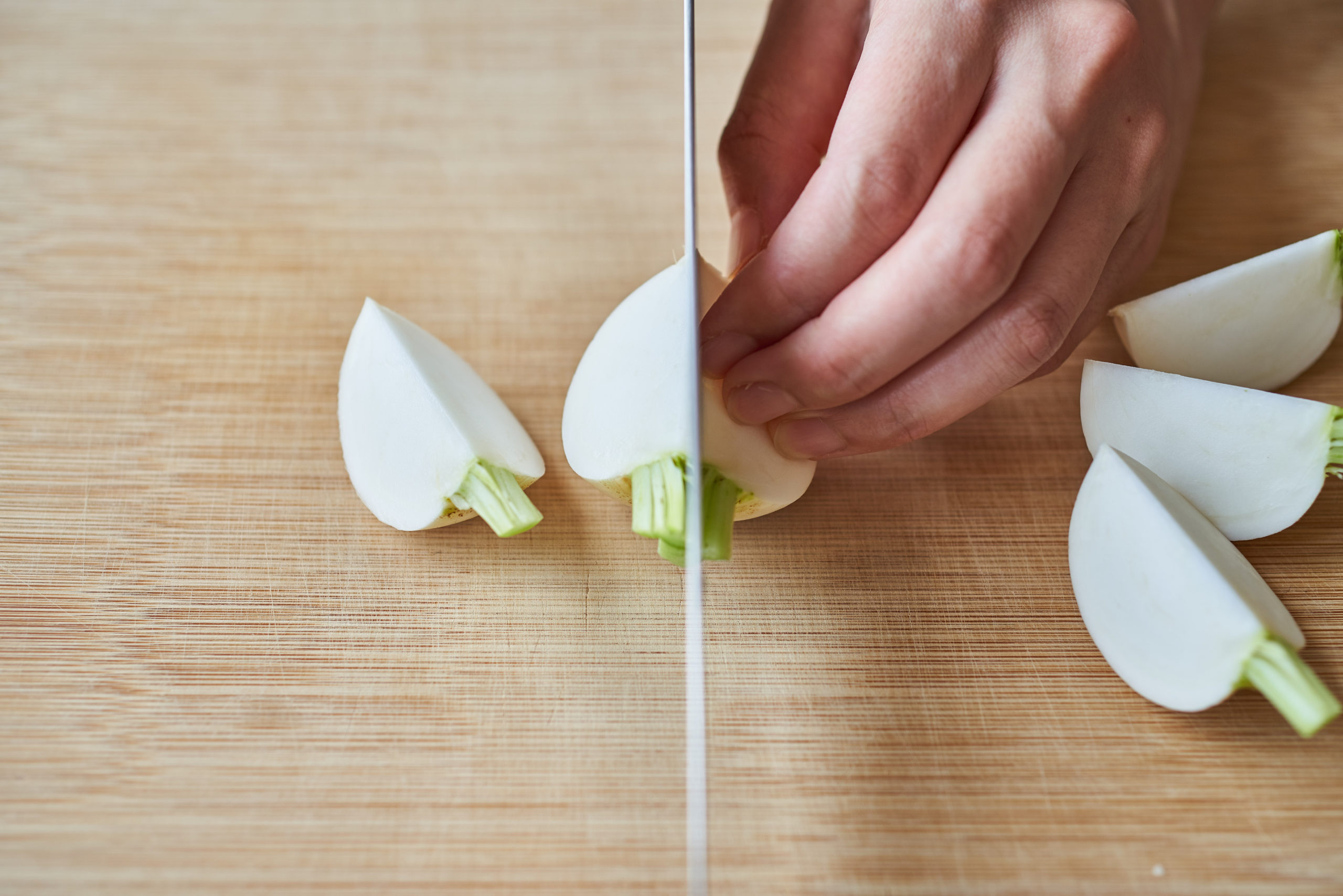 かぶは1cmほど茎を残して六つ割りにする。