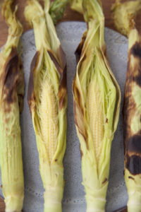 ヤングコーンは皮を残して焼くことでじっくり火が入り甘く仕上がります。