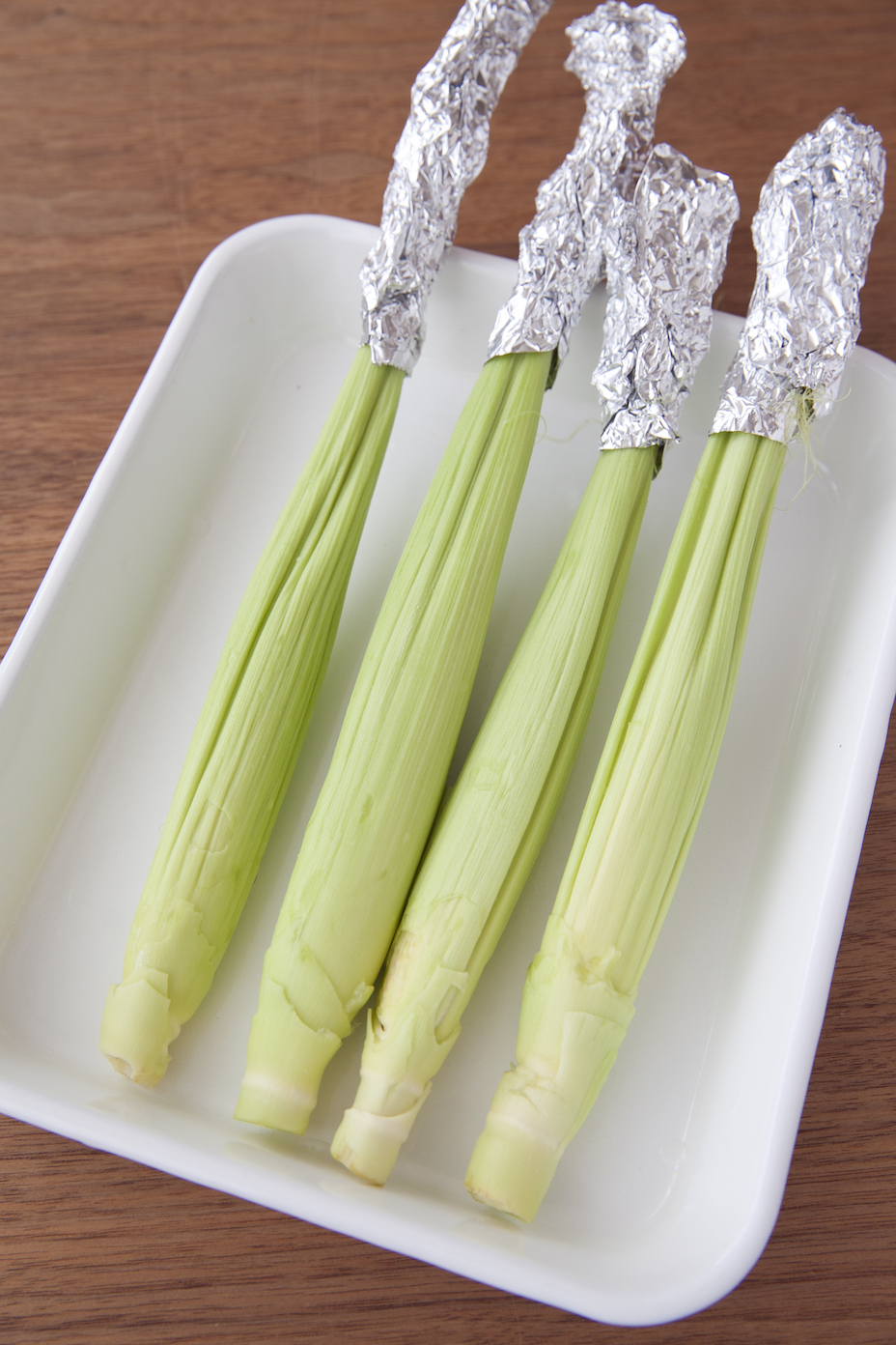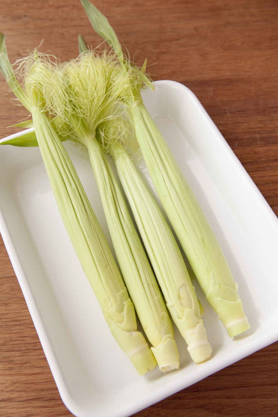 ヤングコーンは皮を残して焼くことでじっくり火が入り甘く仕上がります。