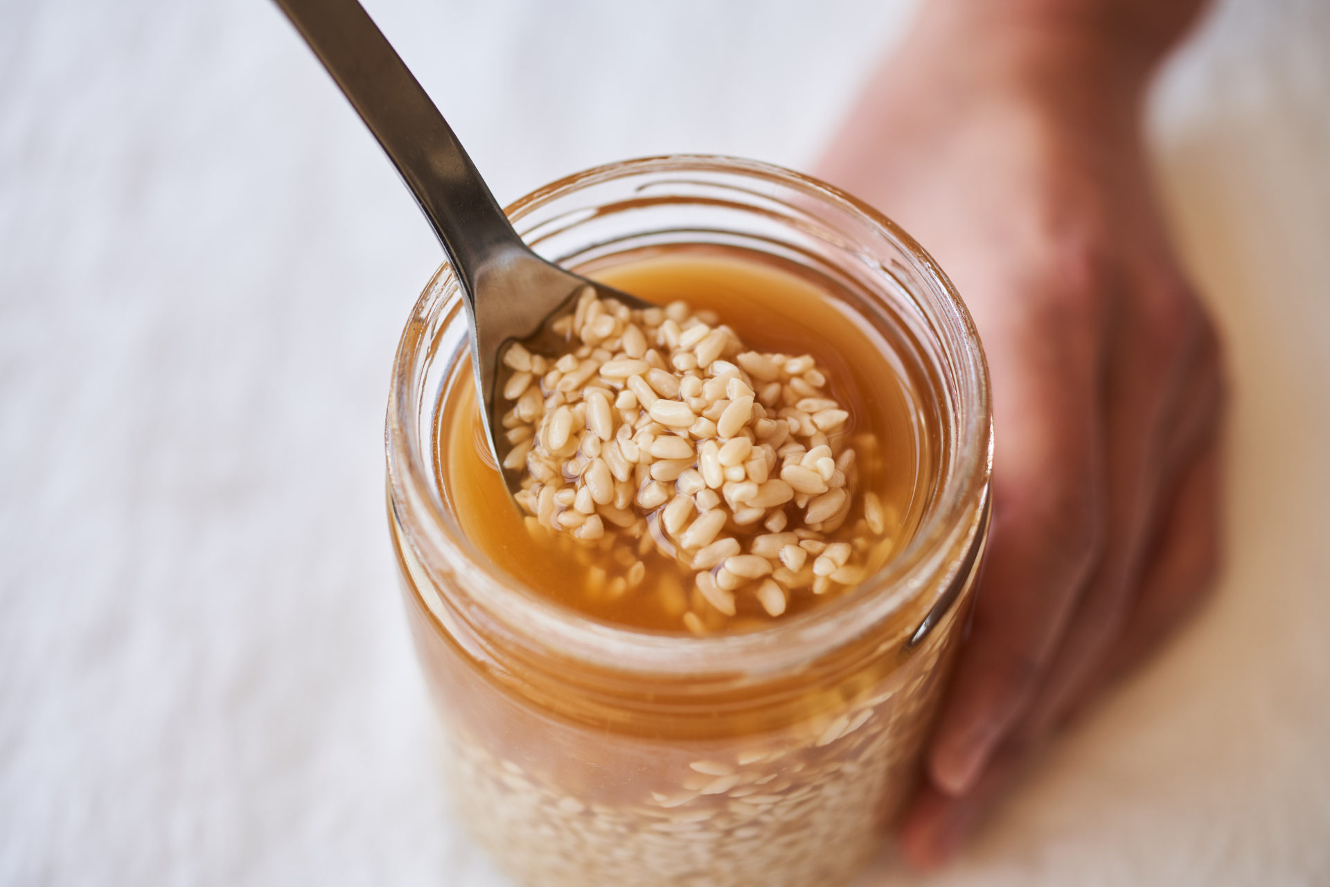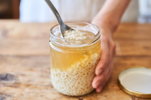 清潔な保存瓶に米麹、米酢をいれてよく混ぜ、直射日光の当たらない常温におく。