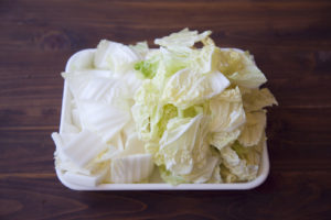 玉ねぎは細切りにする。白菜は芯と葉に分けて4cm四方に切る。