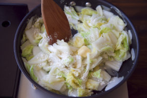 しんなりしたら白菜の芯、葉の順に加え炒める。