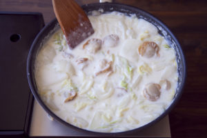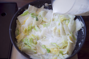 白菜がしんなりしてカサが減ってきたらバター、 薄力粉を加えて炒める。