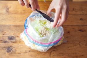 白菜は2cm幅に切り、ジッパー付き保存袋に入れる。