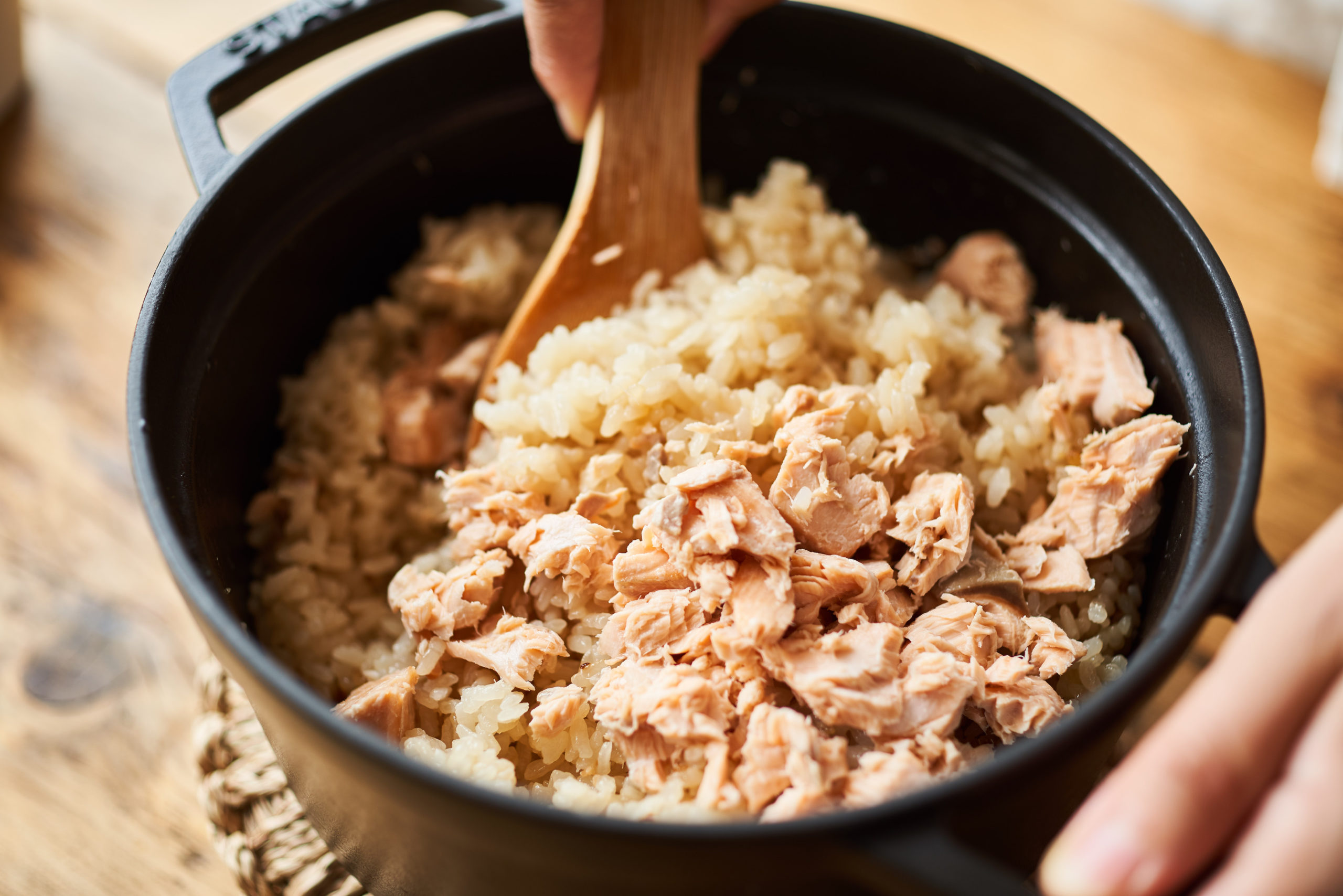 鮭をほぐして骨を取り除きごはんに混ぜて、