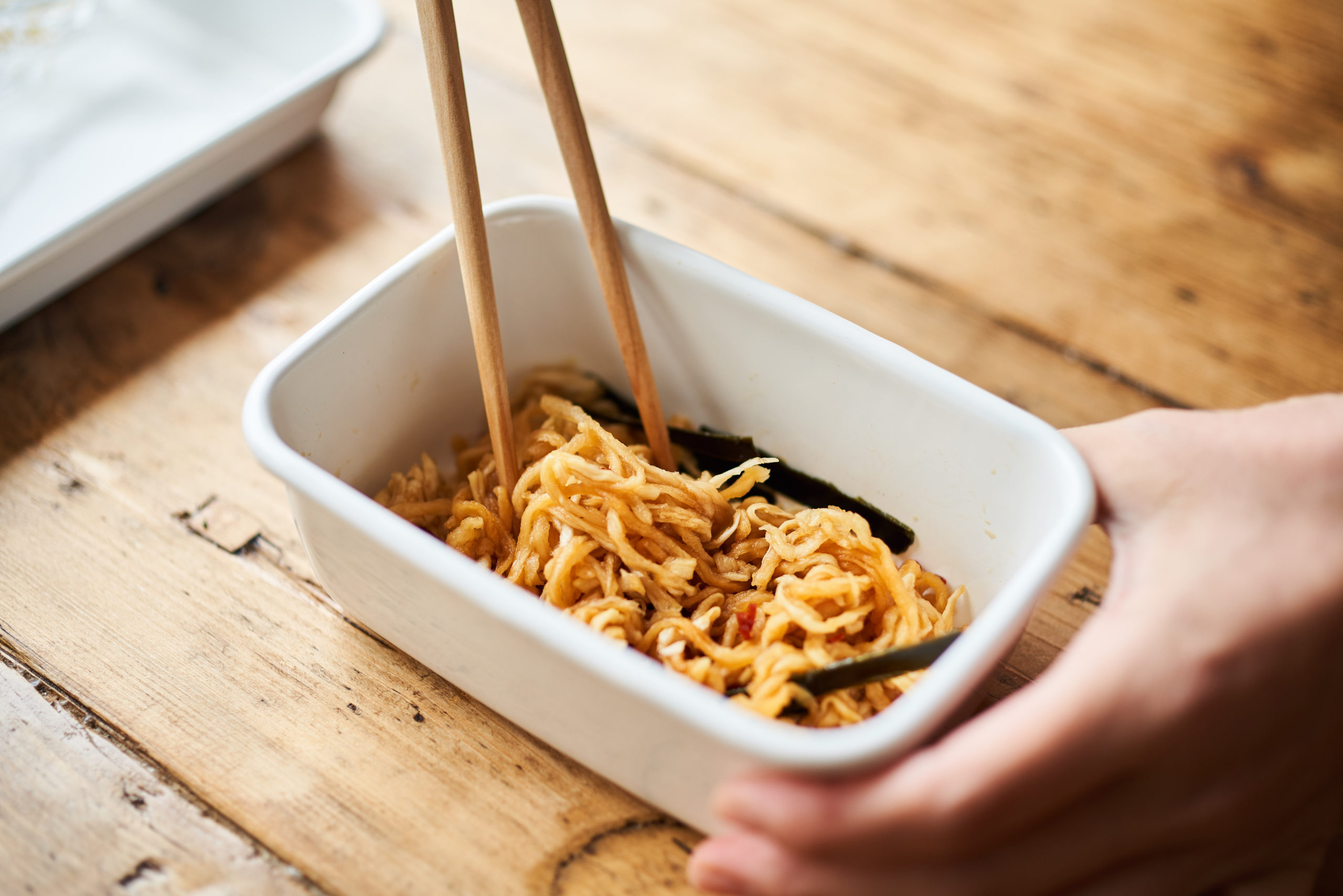 しっかり水気を絞り、長ければ食べやすい長さに切って保存容器に入れる。